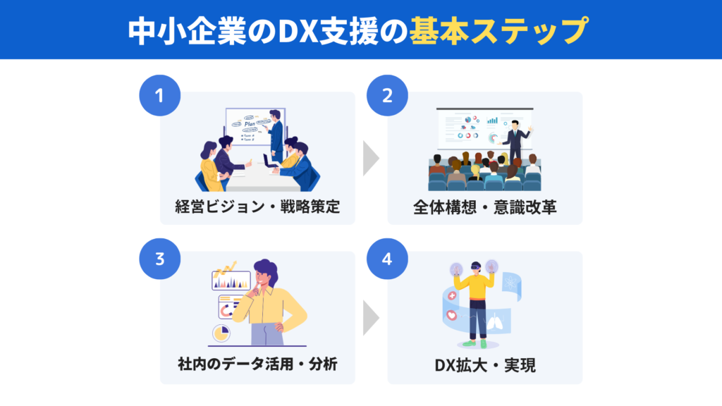 特に、限られたリソースの中で効率的にDX化を進めるためには、外部からのDX支援が重要です。支援機関のサポートを受けることで、専門的な知識や技術を活用し、自社に最適なDX戦略を構築することが可能になります。