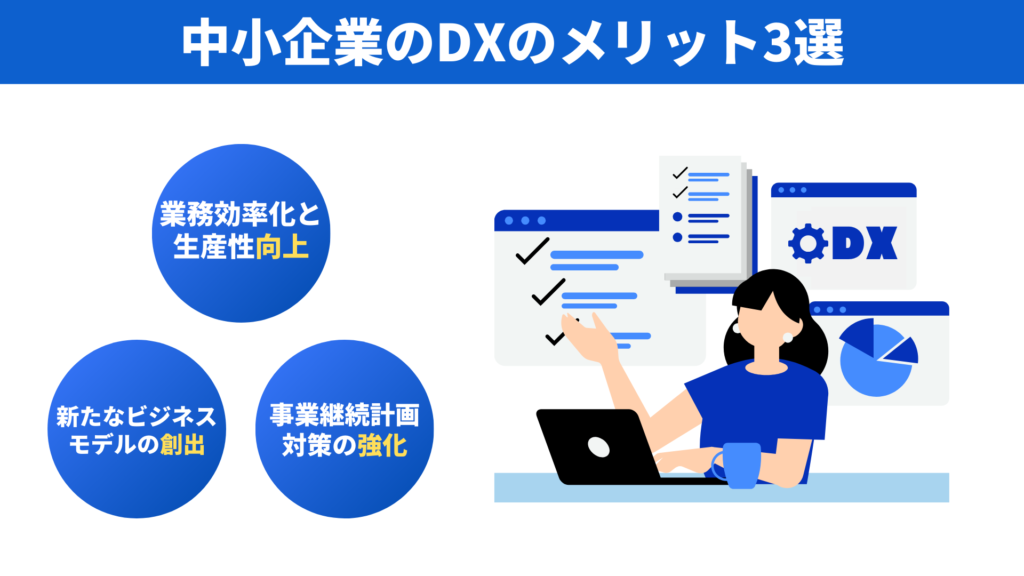 中小企業のDXのメリットとしては、以下の3つが挙げられます。