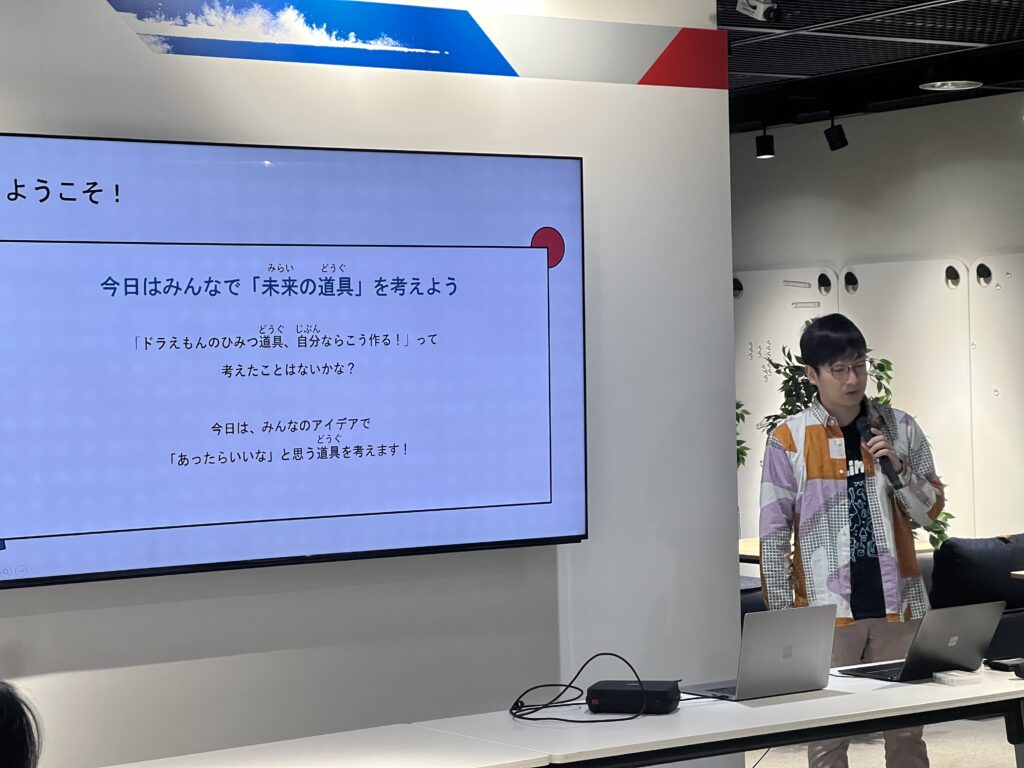 ワークショップの講師を務めたのは、リベロエンジニア社長室の田村雄太さんです。 田村さんは冒頭、子どもたちに向けて「イノベーションとは何か」を分かりやすく解説しました。