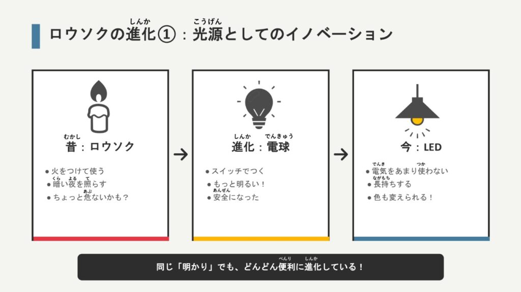 「電球がLEDに進化したような『技術の進化』だけでなく、ロウソクが照明からリラックス用品に変わったような『使い方の変化』もイノベーションなんだよ」と説明し、子どもたちの自由な発想を引き出しました。