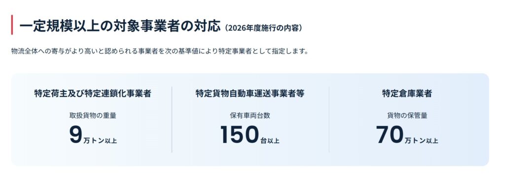 この基準に該当する事業者は、2026年度より法的義務の対象となります(「物流効率化」理解促進ポータルサイトより引用)
